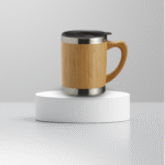 An eco-friendly bamboo insulated coffee mug featuring a sturdy handle and stainless steel rim. Designed to combine sustainability with style, this mug keeps beverages warm while adding a natural, elegant look to any workspace or home.