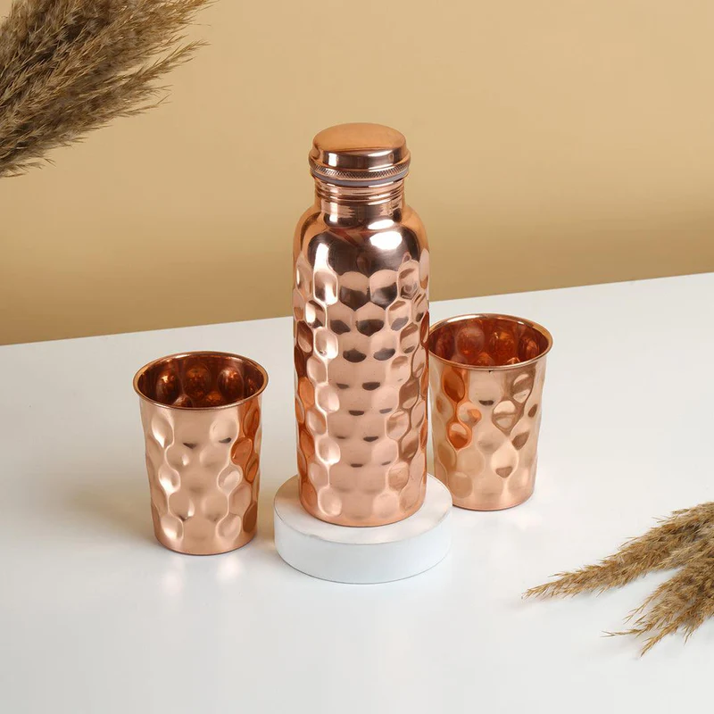 Made from pure copper with a fascinating pattern on the outer surface, this water bottle and tumbler set is perfect for a health freak. drinking water from a copper vessel is known to have many health benefits!