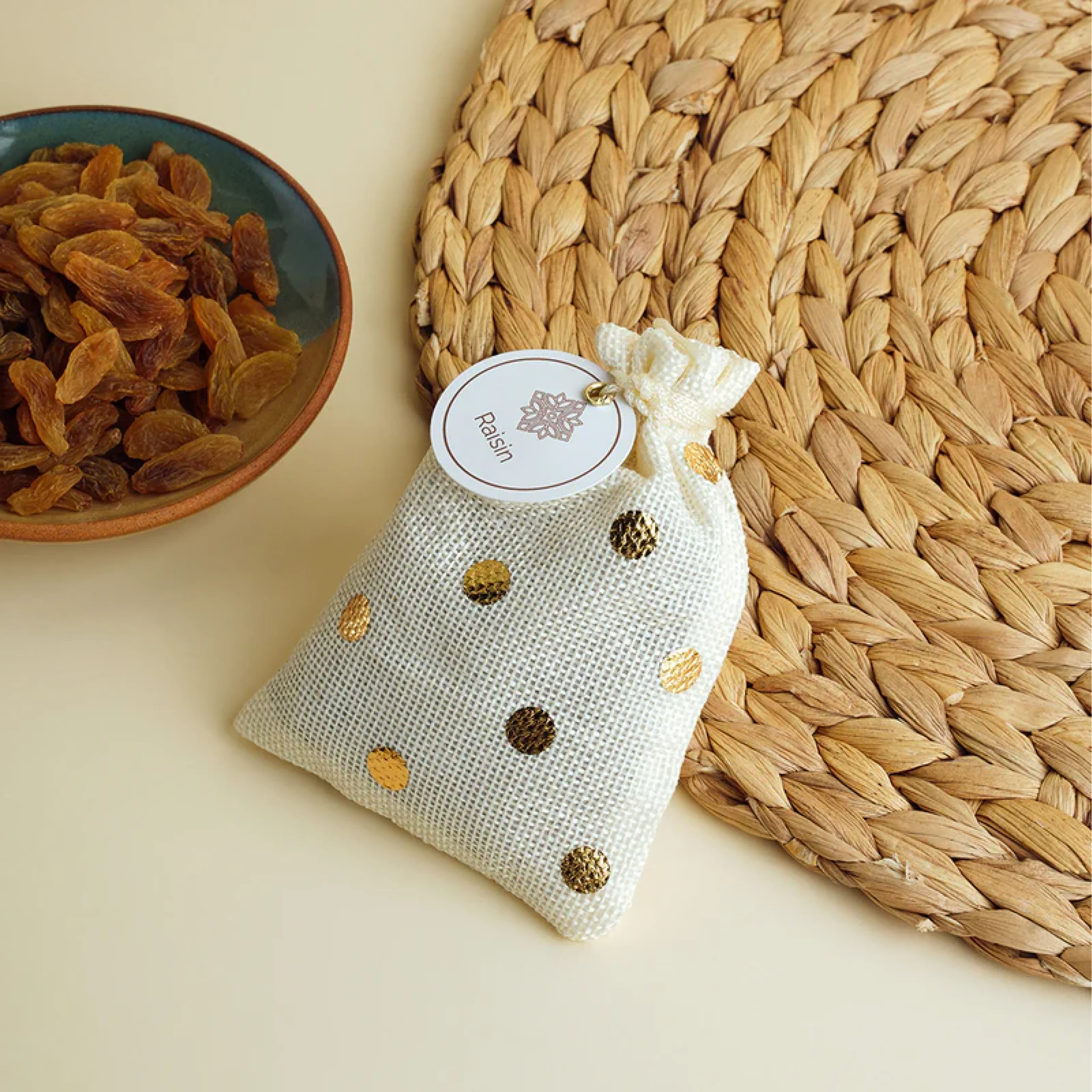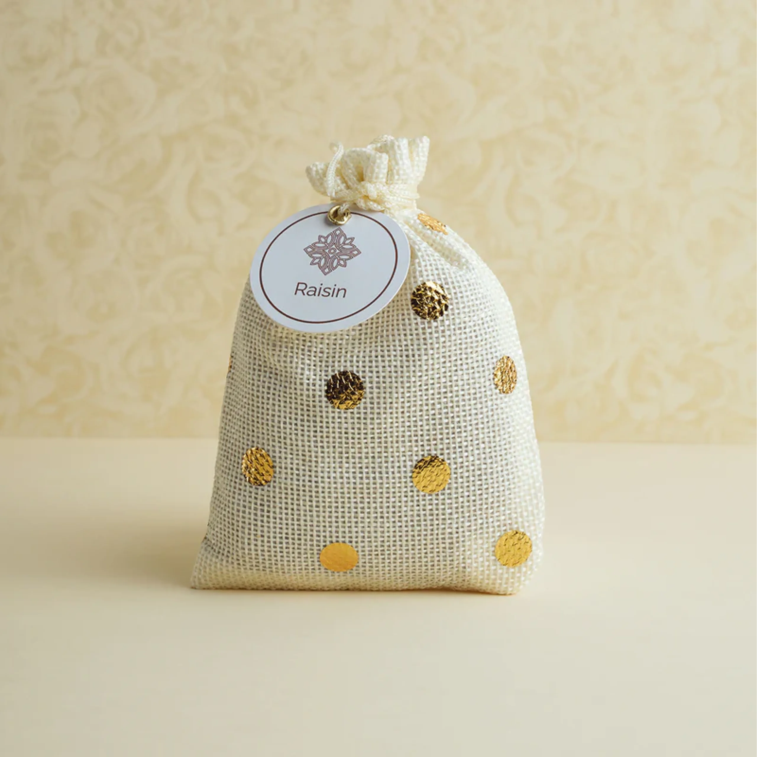 Sweet, chewy raisins presented in a charming potli bag. A simple yet thoughtful gift option rooted in tradition.