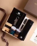 A refined corporate gifting solution crafted for professionals. This premium box includes a personalized notebook, insulated travel tumbler, stainless steel bottle, executive pen, and metal keychain—presented in a luxury rigid box. Ideal for onboarding kits, leadership gifting, and high-impact corporate events.