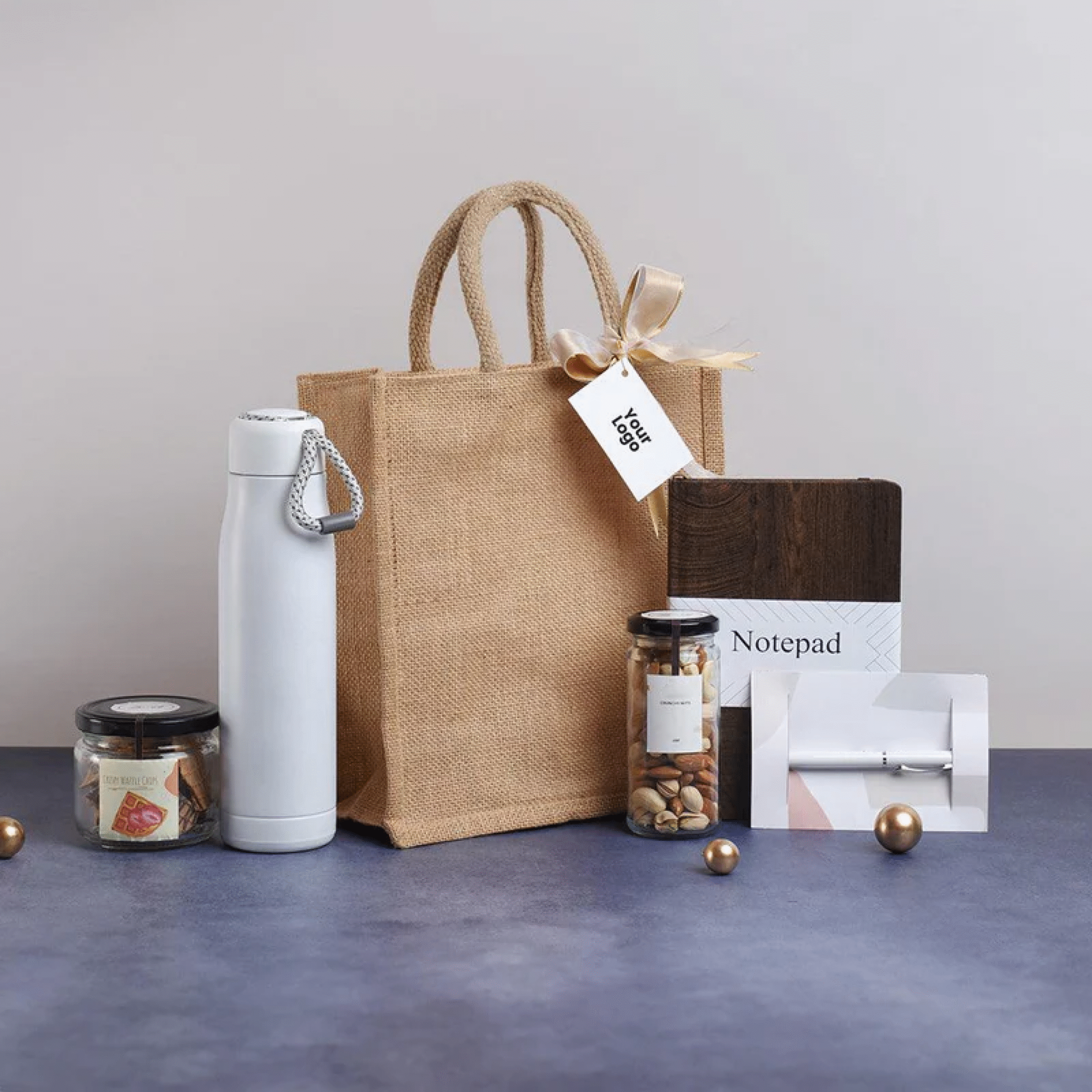 - The focus for this gift was on the contents, not the outer packaging. Instead of a box, the hamper is presented in a versatile, reusable jute bag. This choice is both practical for the recipient and aligns with our commitment to being eco-conscious.